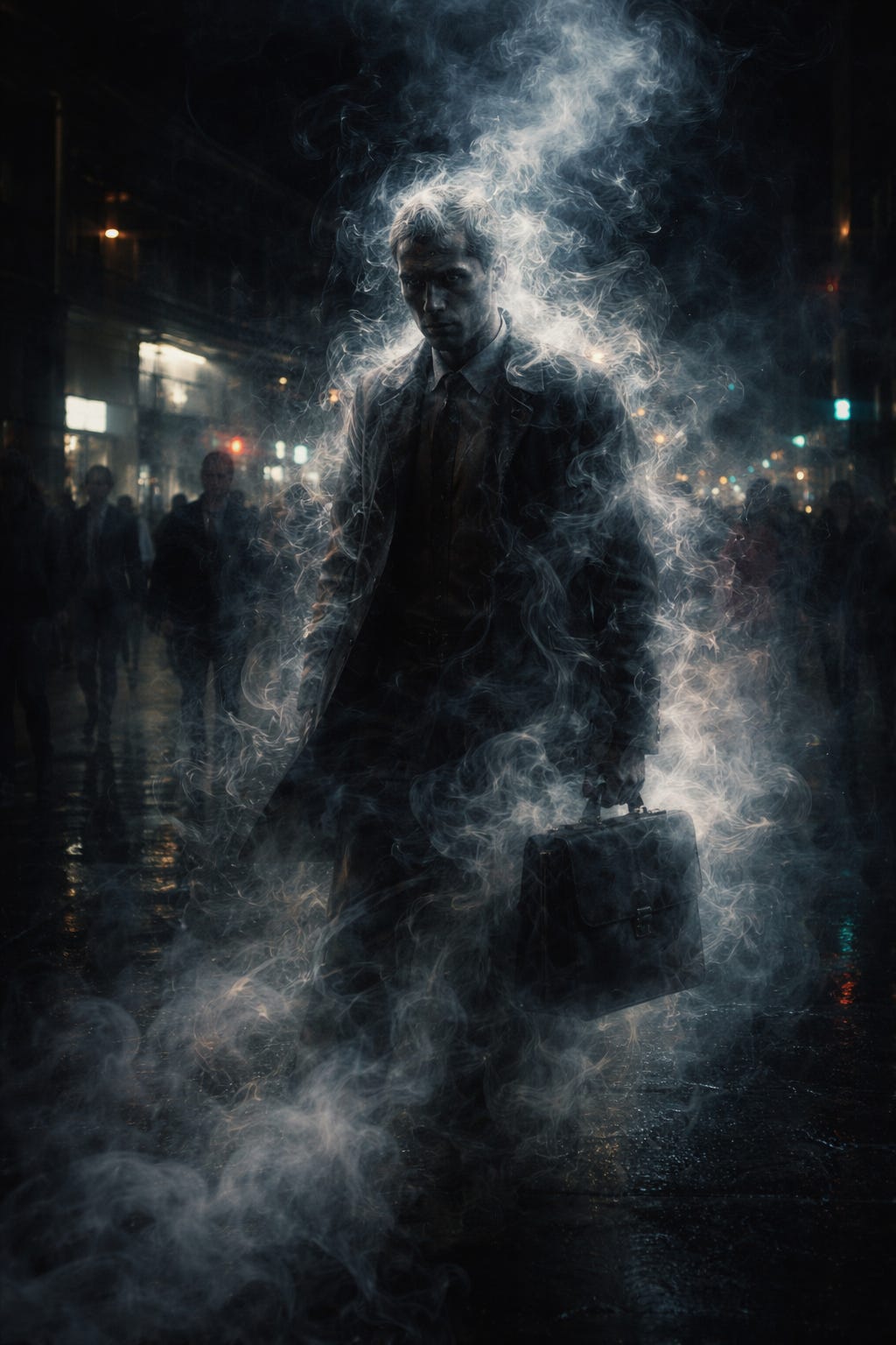 The elevator doors close while he’s still inside the threshold. The pressure brushes the coat. The car descends without registering extra weight.